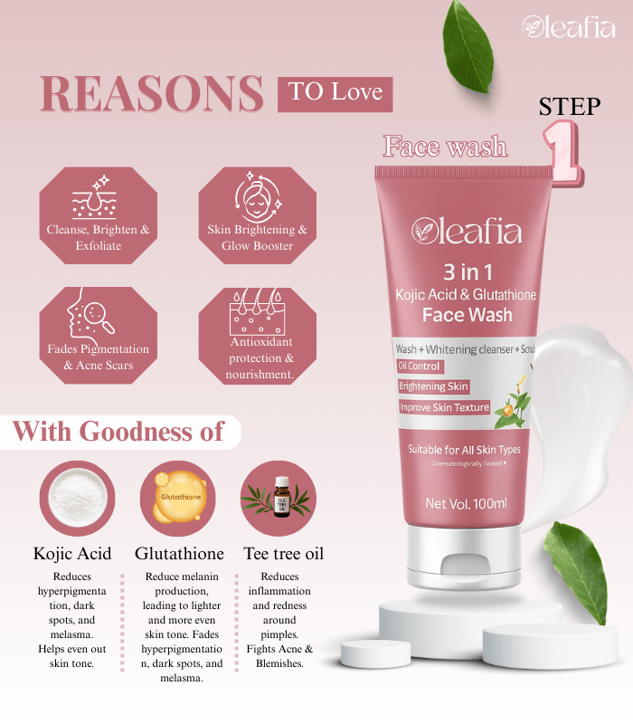 Oleafia Kojic Acid & Glutathione 3-in-1 Facewash – A powerful triple-action cleanser that washes, gently exfoliates, and brightens. Enriched with Kojic Acid and Glutathione, it effectively reduces dark spots, evens skin tone, and improves skin texture while keeping it soft and supple.
