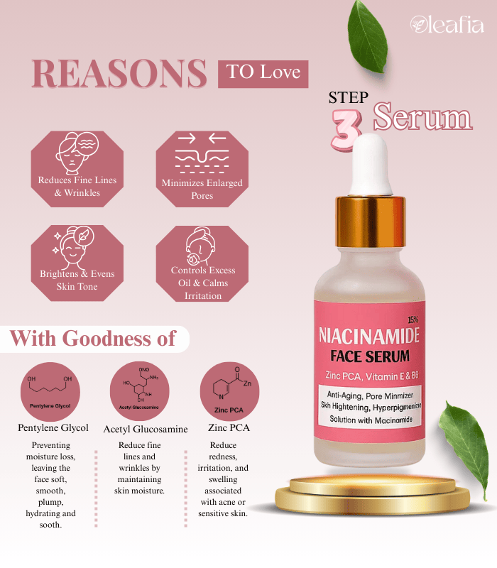 Oleafia 15% Niacinamide Face Serum – A potent formula with Niacinamide, Zinc PCA, Vitamin E, and Vitamin B5 to fight signs of aging, minimize pores, brighten skin, and target hyperpigmentation. This lightweight, fast-absorbing serum strengthens the skin barrier while keeping it hydrated and smooth.