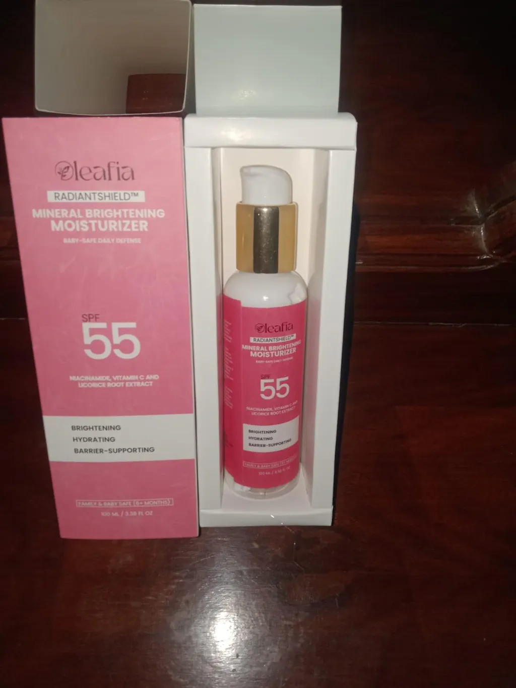 Oleafia RadiantShield™ Mineral Brightening Moisturizer SPF 55 is a dermatologist-formulated, baby-safe sunscreen and daily moisturizer crafted for the most sensitive skin. This hybrid of hydration and protection uses 100% mineral UV filters — non-nano Zinc Oxide and Titanium Dioxide — to provide broad-spectrum SPF 55 defense against UVA and UVB rays without irritation or synthetic additives. Infused with Niacinamide, Ascorbyl Glucoside (Vitamin C derivative), and Licorice Root Extract, it gently brightens dull skin, supports barrier repair, and evens tone. The hypoallergenic base enriched with Squalane, Panthenol, and Hyaluronic Acid ensures all-day comfort, while no fragrance, no essential oils, and no dyes make it safe for babies (6 months+) and adults alike. A lightweight water-in-oil emulsion, Oleafia RadiantShield™ absorbs easily, leaving a smooth, non-greasy finish with minimal white cast — perfect for daily wear and family-friendly use.